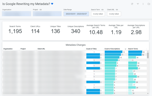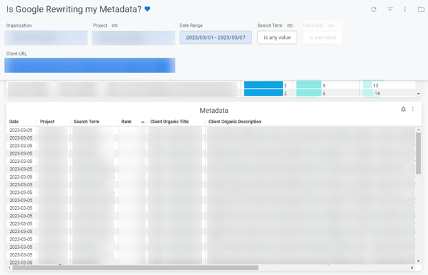 This entire test would not be possible without Supernova. Seer’s innovation team created a “Is Google rewriting my metadata?” dashboard within Supernova for account teams to utilize. Data in this dashboard helps us identify how often Google is changing your metadata, understand how metadata changes when Google serves the same result for different search terms, and uncover trends about where on the page Google is pulling content from when serving changed metadata. With this data ready, we conducted the following test: